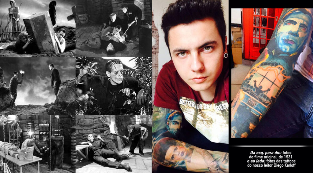 Sou fanático pelos monstros clássicos da Universal da década de 30, como Frankenstein, Drácula, Wolfman, entre outros. Desde criança eu era fascinado por eles, por ser algo diferente do que estamos acostumados a ver. Resolvi fechar o braço com o tema que eu mais gosto de filmes. Então comecei com os personagens citados e mais a noiva do Frankenstein. No fundo tem o castelo do Frankenstein com raios e aparelhagens dando vida ao monstro. Tem também um poema famoso do Wolfman escrito na parte interna do braço: “Even a man who is pure in heart and says his prayers by night may become a wolf when the wolfbane blooms and the moon is full and bright”.